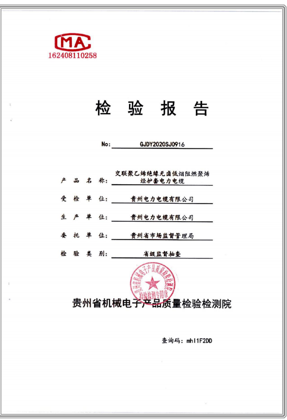 交聯(lián)聚乙烯絕緣無鹵低煙阻燃聚烯烴護套電纜 檢驗報告